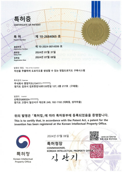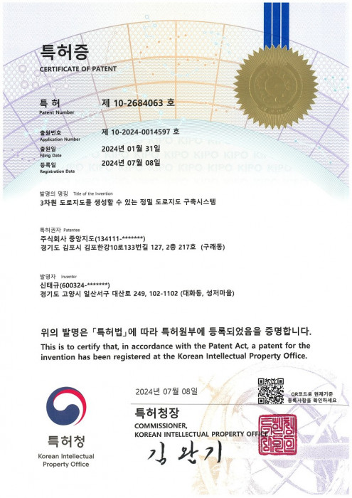 (특허증)3차원 도로지도를 생성할 수 있는 정밀 도로지도 구축시스템